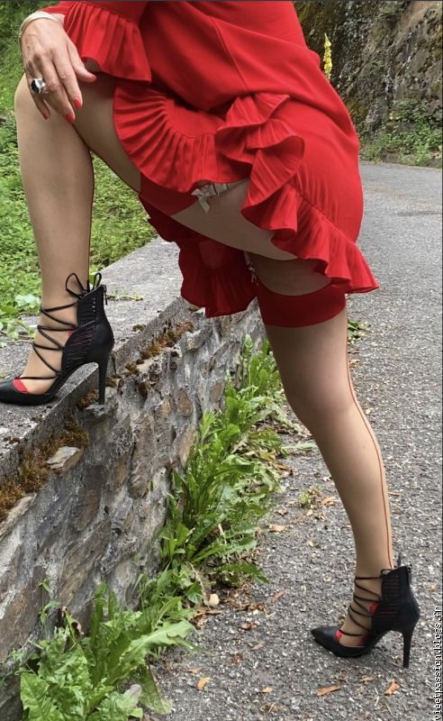 Je craque ! Une fois encore je craque. On atteint des sommets de plaisir avec cette pose mi-coquine, mi-sensuelle. Que tu es sexy ! Est-ce le rouge qui m'affole ainsi, qui me rend zinzin ? Mais non c'est toi qui m'affole, me trouble, me tourneboule. Sublimes jambes et ces talons aiguilles à laçage. Oh la la que c'est magnifique !