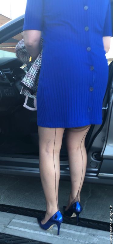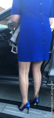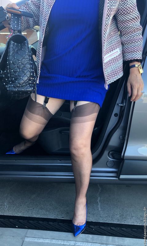 Là c'est terriblement attirant, infiniment jouissif... Quel sublime croisement de (belles) jambes ! La belle robe bleue est remontée, les attaches du pj sont bien visibles. MA-GNI-FI-QUE !