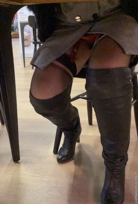 Joli point de vue sur une adorable petite culotte rouge et de très belles cuisses joliment voilées !