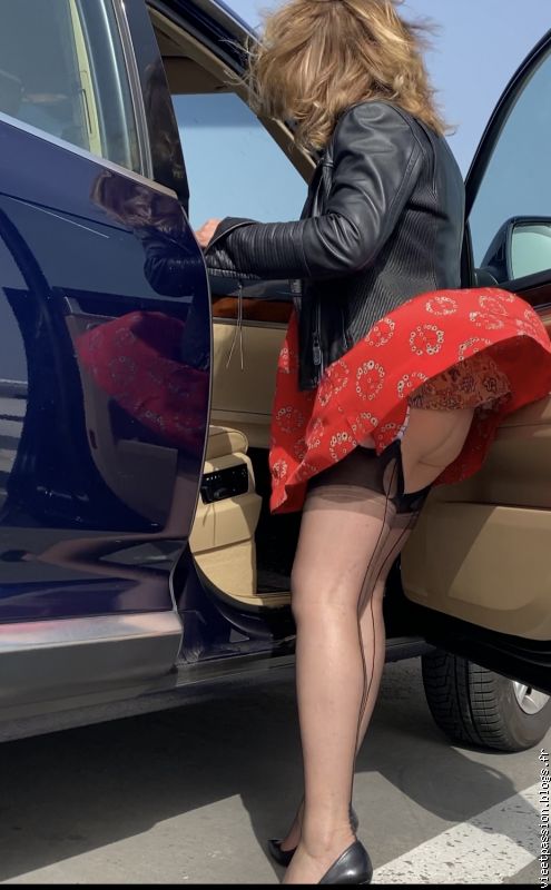Traversant le Parking, je la remarque cette femme aux magnifique courbe, elle attend son mari à la portière de leur voiture. Puis le vent se joue de vous, soulève cette robe rouge que vous portiez ce jour là, découvrant vos bas noirs attachés par un porte-jarretelles ainsi que votre mont de vénus. Je continue mon chemin tout en remerciant le dieu Éole pour ce furtive moment. Aujourd'hui encore bien des années plus tard ce souvenir continue d'hanter mes nuits -