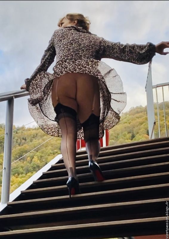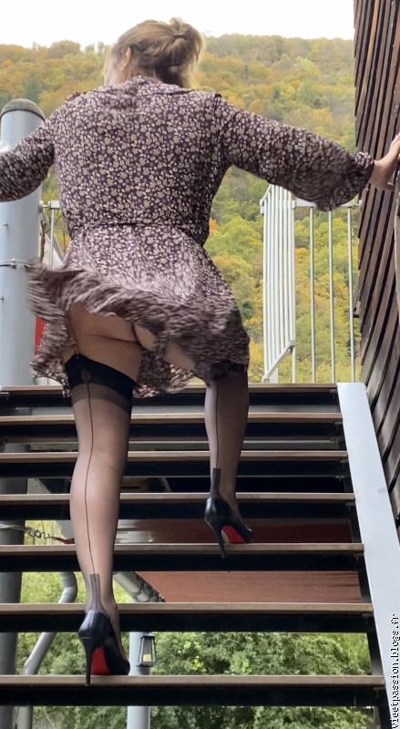 Très belle marche des marches en jolie robe et talons aiguilles. Faut laisser passer les dames en premier... et mâter tes belles jambes et ton fessier... puis remercier cet allié qu'est le vent. -